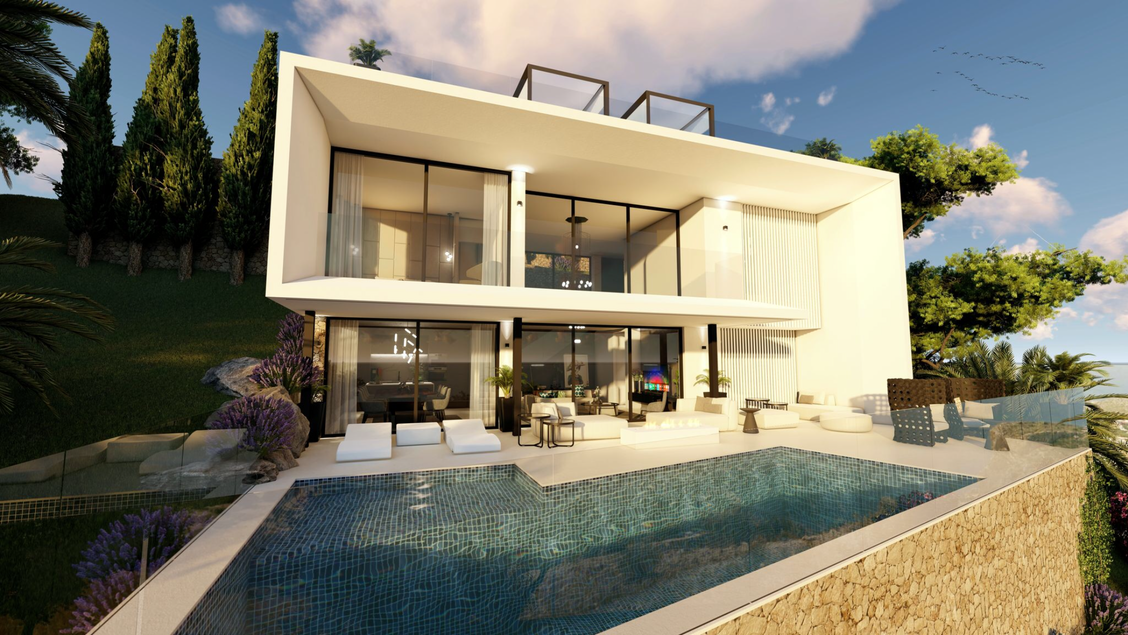 This stunning “White” villa has been beautifully designed for a sloped plot to enjoy amazing views of the surrounding